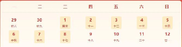 10月1日(星期三)至10月8日(星期三)放假调休,共8天。