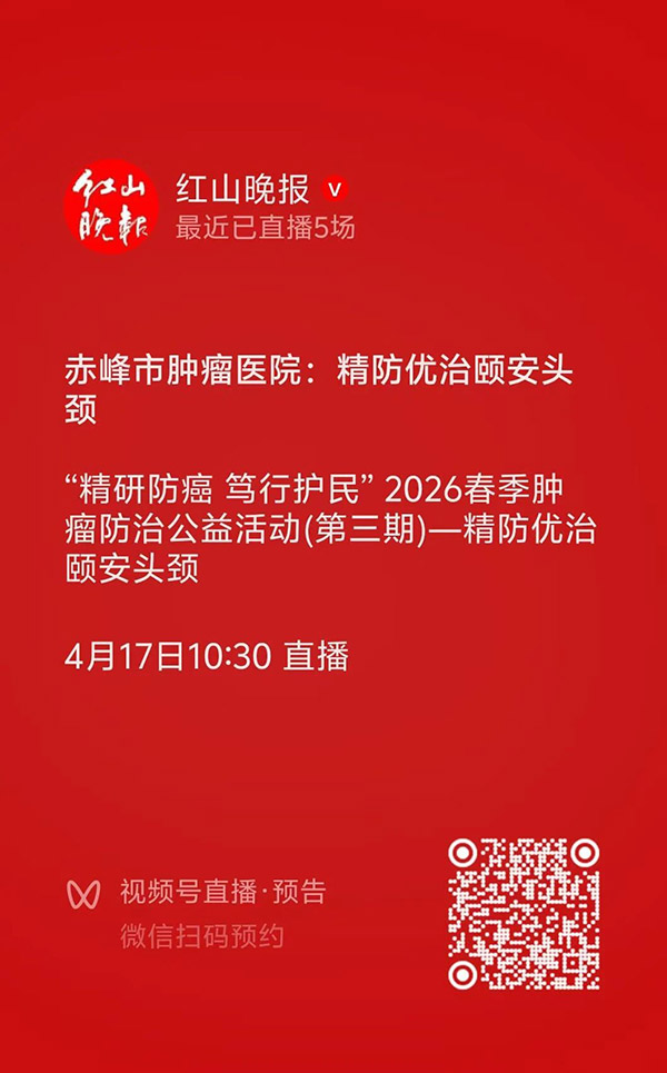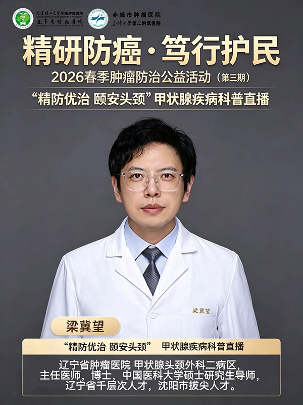 4月17日(周五)上午10:00, 赤峰市肿瘤医院携手辽宁省肿瘤医院,在红山晚报视频号举办“精研防癌?笃行护民”2026春季肿瘤防治公益活动(第三期)直播科普活动。本期邀请辽宁省肿瘤医院,甲状腺头颈外科二病区、主任医师、医学博士、中国医科大学硕士研究生导师、辽宁省千层次人才,沈阳市拔尖人才,梁冀望教授带来的甲状腺科普直播。