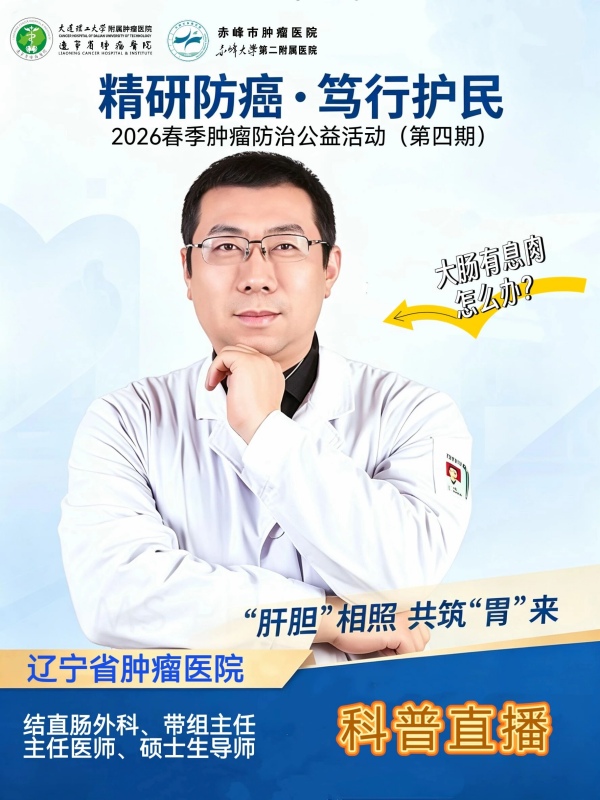 4月24日(周五)上午10:00, 赤峰市肿瘤医院携手辽宁省肿瘤医院,在红山晚报视频号举办“精研防癌?笃行护民”2026春季肿瘤防治公益活动(第四期)直播科普活动。本期邀请辽宁省肿瘤医院结直肠外科带组主任、主任医师、硕士生导师 林涛 教授做客直播间。林教授带来的“大肠有息肉怎么办”科普直播。
